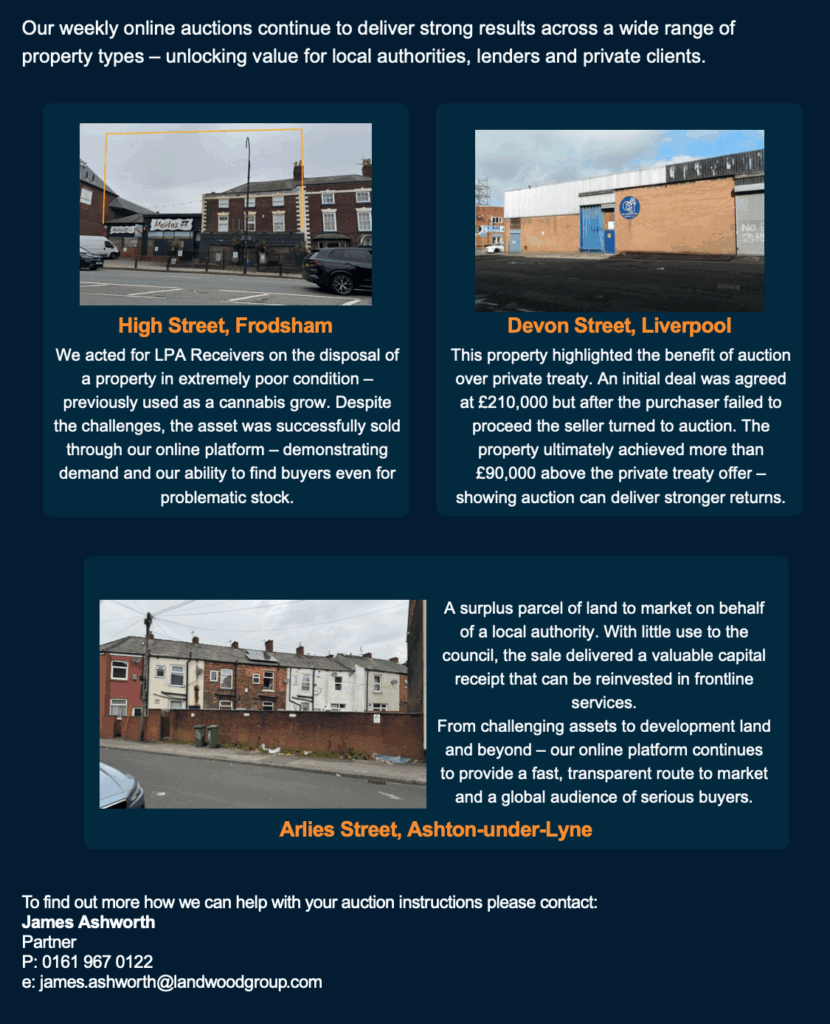 Our weekly online auctions continue to deliver strong results across a wide range of property types – unlocking value for local authorities, lenders and private clients.
